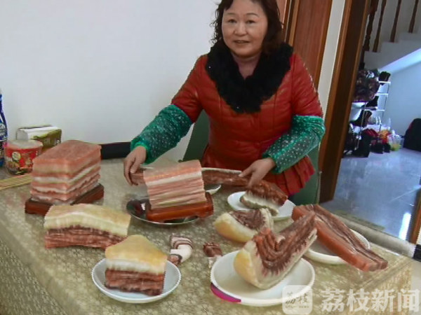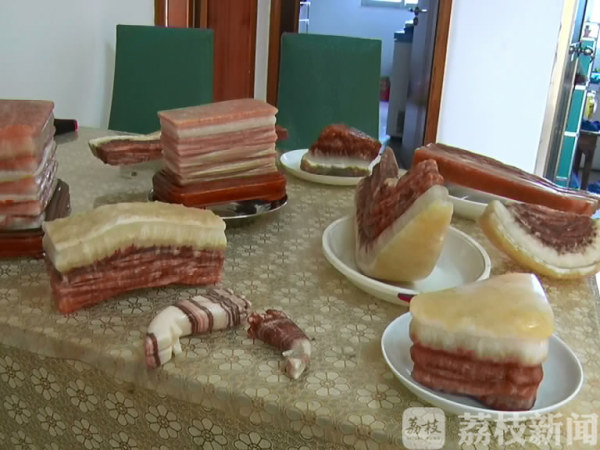 今天(1月21日)上午,在南京六合区横梁街道方山社区的熊女士家,一桌“肉石宴”吸引了人们的目光。满屋形状各异的肉石,有的像刀子肉,有的像五花肉,有的像红烧肉,有的像头刀肉,还有猪蹄子,栩栩如生。远远望去,好似一道道刚刚出锅烹制过肉食美味,香味扑鼻。