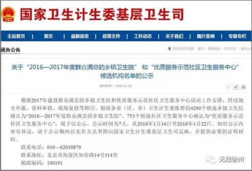近日,国家卫计委网站公布了《关于“2016—2017年度群众满意的乡镇卫生院” 和“优质服务示范社区卫生服务中心”候选机构名单的公示》,其中4290个乡镇卫生院、753个社区卫生服务中心上榜,公示期为2018年1月16日至2018年1月22日。