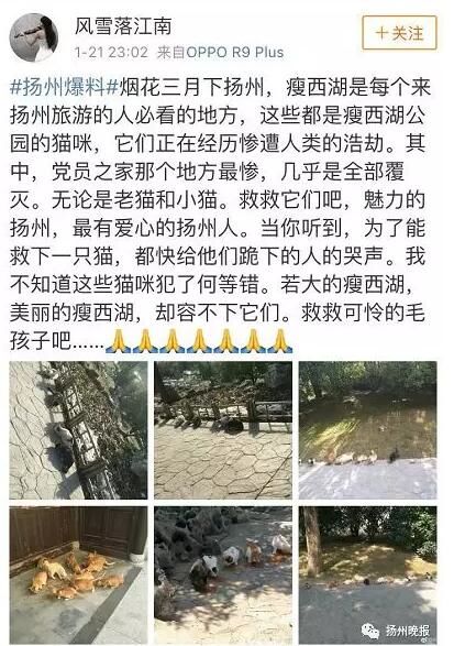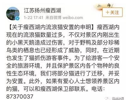 近日来,有网友爆料称:“瘦西湖的猫面临灭顶之灾,昨天下晚,公园里面惨叫连连,据说要打几天。”