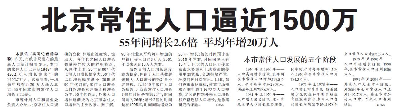 1991年至2004年——外来人口大量增加阶段。到2004年全市常住人口达到1492.7万人,在全市增加的人口中,外来人口占到63%。