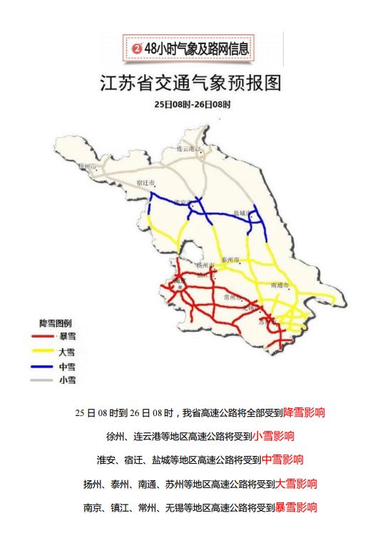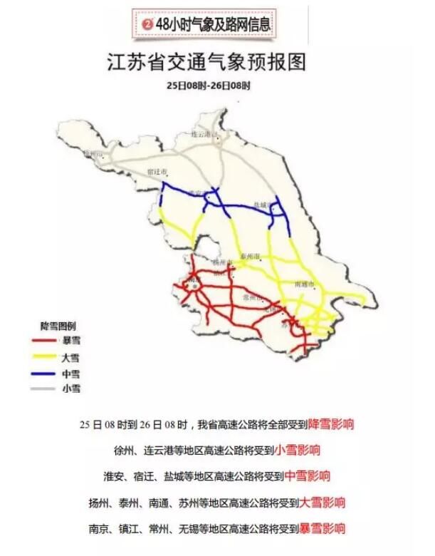 气象台首席表示,白天水汽还没有到达,预计最早也要今晚20:00开始。目前今天白天还是由冷高压控制,全省都是晴好天气。水汽从西南方向上来,所以南京首当其冲,然后就是沿江苏南,强降雪区域在沿江苏南然后由南向北蔓延全省,雪量也是由南向北减弱,今天前半夜雪量较小,主要是后半夜沿江苏南会有中到大雪,北边小到中雪,明天白天发展鼎盛,沿江苏南全天都是大到暴雪,淮北小到中雪、江淮中到大雪。明早南京会有4-5厘米的积雪,26号停歇,26号夜里到28号第二轮水汽补充,沿江苏南有大到暴雪,淮北小到中雪、江淮中到大雪。