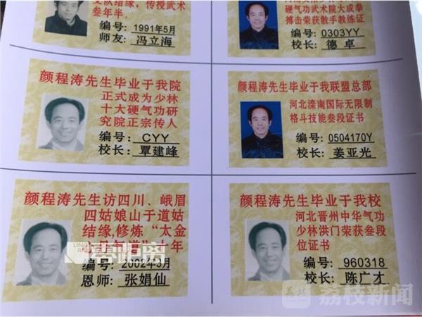 由于痴迷武术,颜程涛一心扑在了练武上,关掉工厂,家中的所有事物都交给妻子打理,四处学武的他向记者展示了多家武校的毕业证书,其中名头较响的有,2006年获得河北滦南国际无限制格斗的二级教练证。不过对此,颜程涛并不在意,他甚至坦言这个证花钱就能弄来,他最擅长的还是内家拳。为了向记者证明自己,他拿出三只啤酒瓶平放在水泥板上,两侧的两只酒瓶包上毛巾,随后,他又在酒瓶上垫上十厘米厚的软垫。