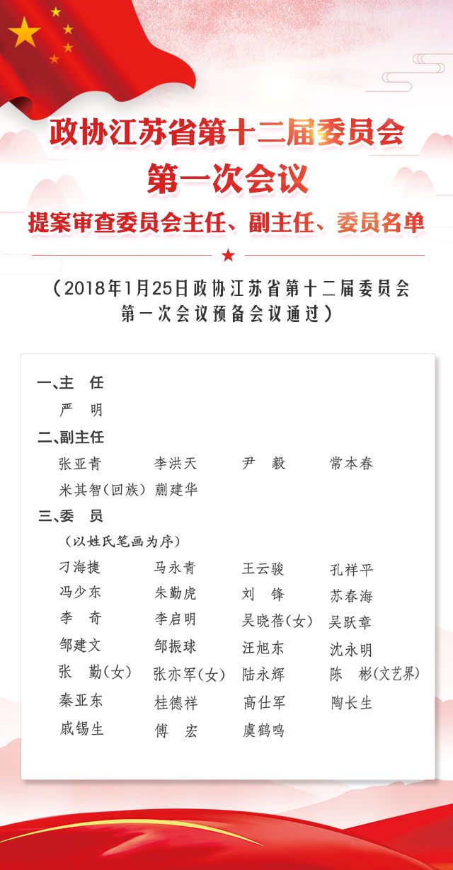 荔枝新闻讯 1月25日,江苏省政协十二届一次会议预备会议召开,通过大会提案审查委员会主任、副主任、委员名单。