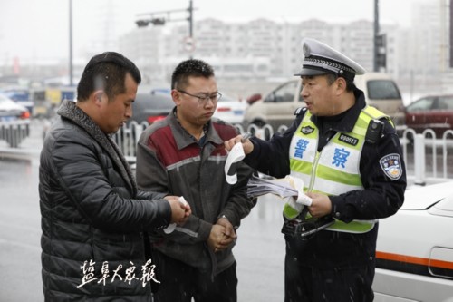 ▲民警左元庆引导电动车去往不结冰的路面
