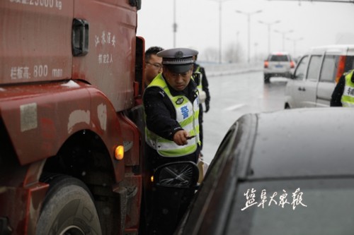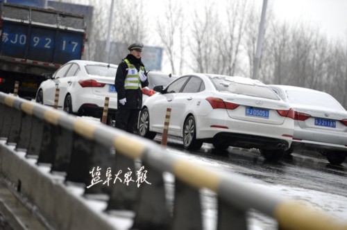 ▲1月25日上午8点, 盐城交警支队一大队民警吴益俊在建军路高架桥范公路上匝道合流处疏导交通。
