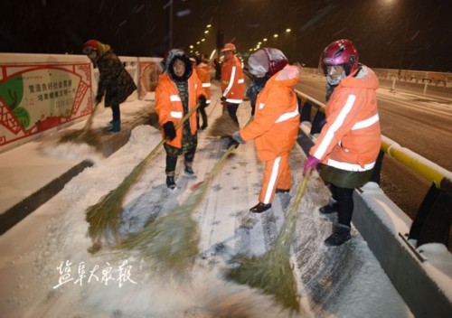 ▲1月25日凌晨4时许,盐城市区860名环卫工人已全部分布15座桥梁,清扫积雪覆盖的人行道、慢车道,4辆铲雪车上路铲雪,环卫车抛撒融雪剂;6时30分500多名城管执法管理人员、局机关及数字城管工作人员按照应急方案,分段、包片、分重点、分主次、逐路、逐段开始接力扫雪工作,确保人行道、桥梁等重要道路安全畅通。