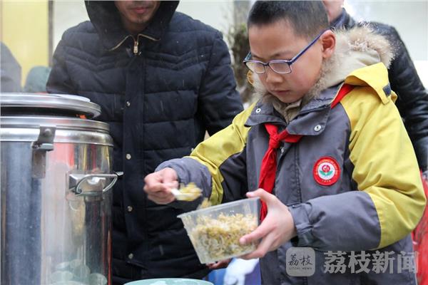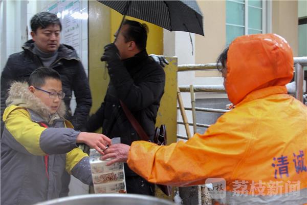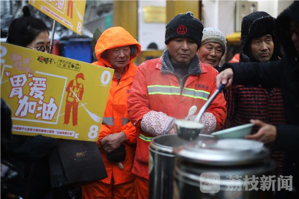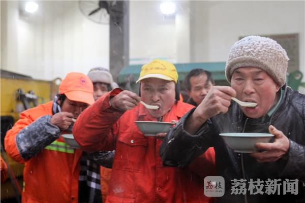 昨夜南京下起了雪,刘平担心工人们早上吃不上饭,召集志愿者今天加送了一份爱心早餐:有馄饨和红豆粥。今年59岁的环卫工人许宝华说,这份爱心早餐她吃了七年,也感动了七年。吃了一碗馄饨,这会儿手也暖了,心也暖了。