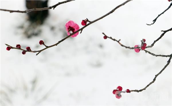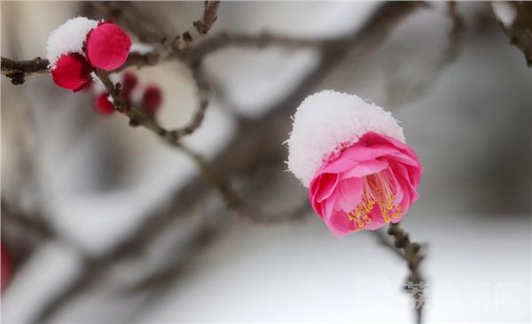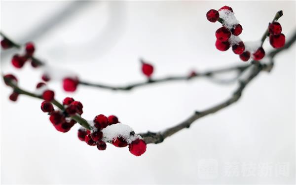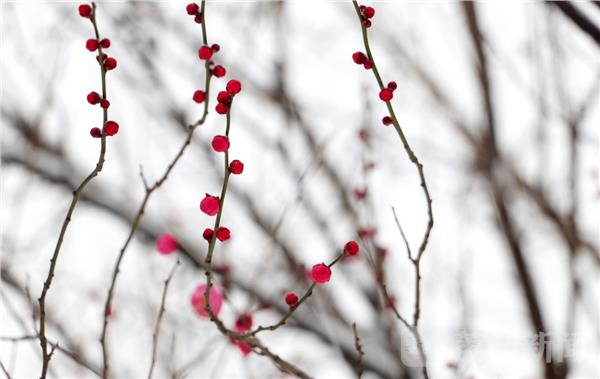 今天一早,记者看到,到处是一派银装素裹,一株株红梅树立其中,满树的红色花苞,在白雪的映衬下更显艳丽。一粒粒紫红色的花骨朵点缀在白雪在树干上,格外醒目,让人感慨这冰清玉洁般的天作美图。而有的花儿则凌寒盛开,令人惊艳,红梅忍受住凛冽的寒冬为人们绽放出如此绚烂的花朵,又有白雪相伴,为人们增添如此美丽的一景。