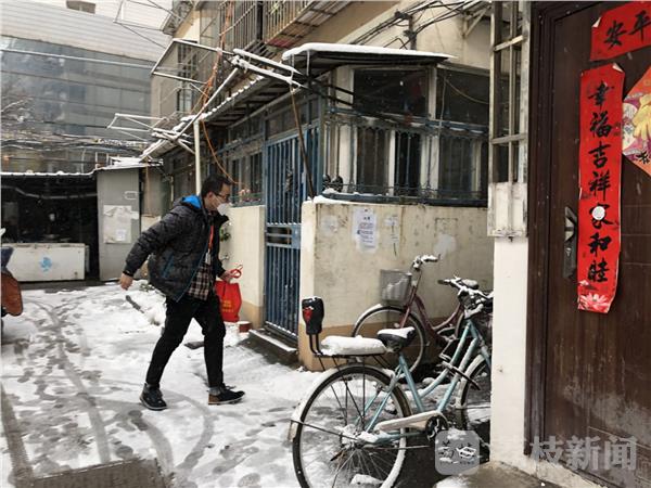 11点多,在南京淮海路31号居民楼小区,地上积着厚厚的雪,90后陈志益小心翼翼的骑着电动车,一不小心就会打滑。车的踏板上放着保温箱,里面放着几份热气腾腾的配餐盒饭。陈志益按了按一楼的防盗门,二楼传来胡奶奶的招呼声。