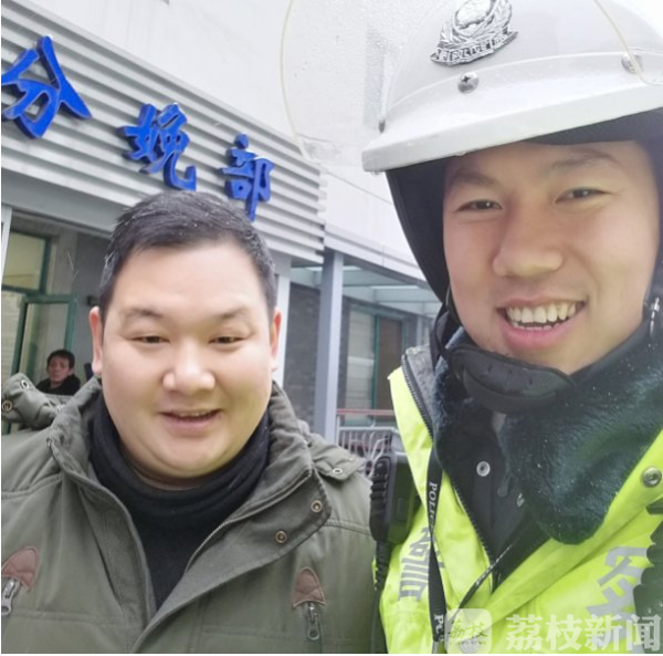 终于,在这绿色通道的护佑之下,王先生一家人开车将孕妇成功送至了苏州市立医院本部的分娩部。当亲眼看着老婆在众人的护送之下进了医院分娩部,王先生提在喉咙的心终于是放下了。而他,也和一路风雪护送的民警季骥合了一张影,纪念这难忘的一个上午,这难忘的一路同行。