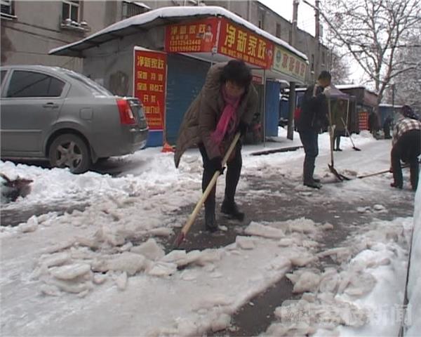由于该小区是个老小区没有物业,早上社区的领导带着很多志愿者前来为小区扫雪除冰。