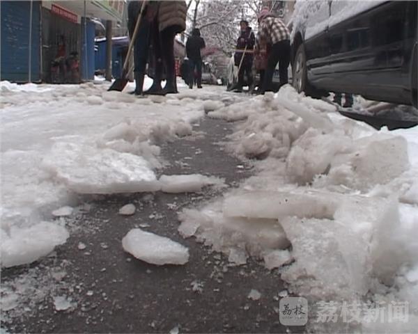 1.26日早上8点钟左右,南京江北新区泰山街道的浦东苑社区,宁港一村,一场大雪后,小区结了厚厚的冰雪。