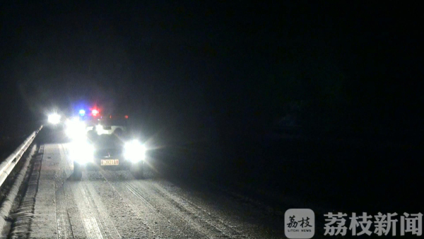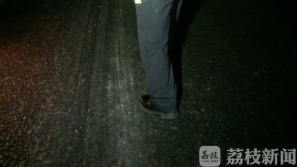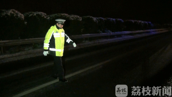 1月25日晚上7点钟,受降雪和降温影响,盐城境内的多条高速路面有结冰现象,存在严重的安全隐患,遂实行特级交通管制,禁止除执行公务的特种车辆以外的车辆上高速行驶。在道路结冰路段,高速交警下车察看路面情况时,路面极滑。