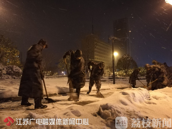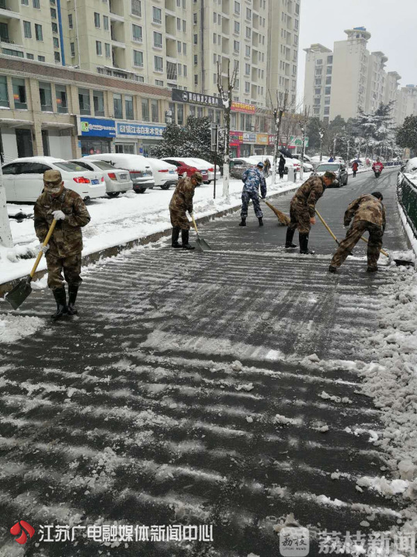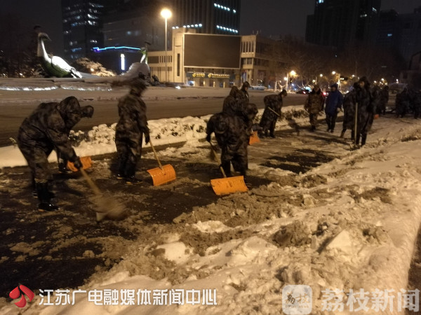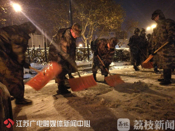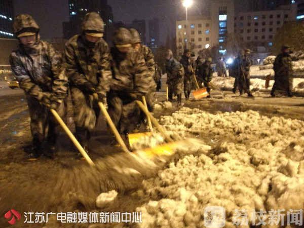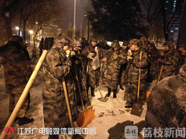 与此同时,8000多名部队、院校官兵在南京的重要交通枢纽与政府扫雪力量一起奋战在扫雪前线。江苏“两会”在江苏大剧院继续召开,执行此地扫雪除冰任务的驻宁某舟桥旅官兵,连续奋战到早上7点,终于圆满完成任务,确保了会议顺利召开。