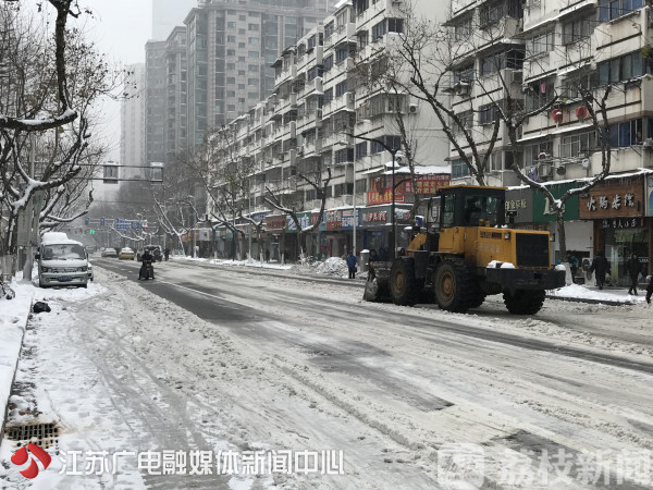 早上9点40分,记者看到南京丹凤街路面上,仍有部分积雪存在,商家们虽组织人员自扫门前雪,但除雪效果并不明显。就在这时,三辆大功率的铲车上路了,它们来回作业,除雪开道。