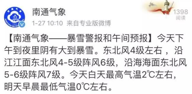 就在刚刚,南通气象再次发布暴雪警报:今天下午到夜里阴有大到暴雪!