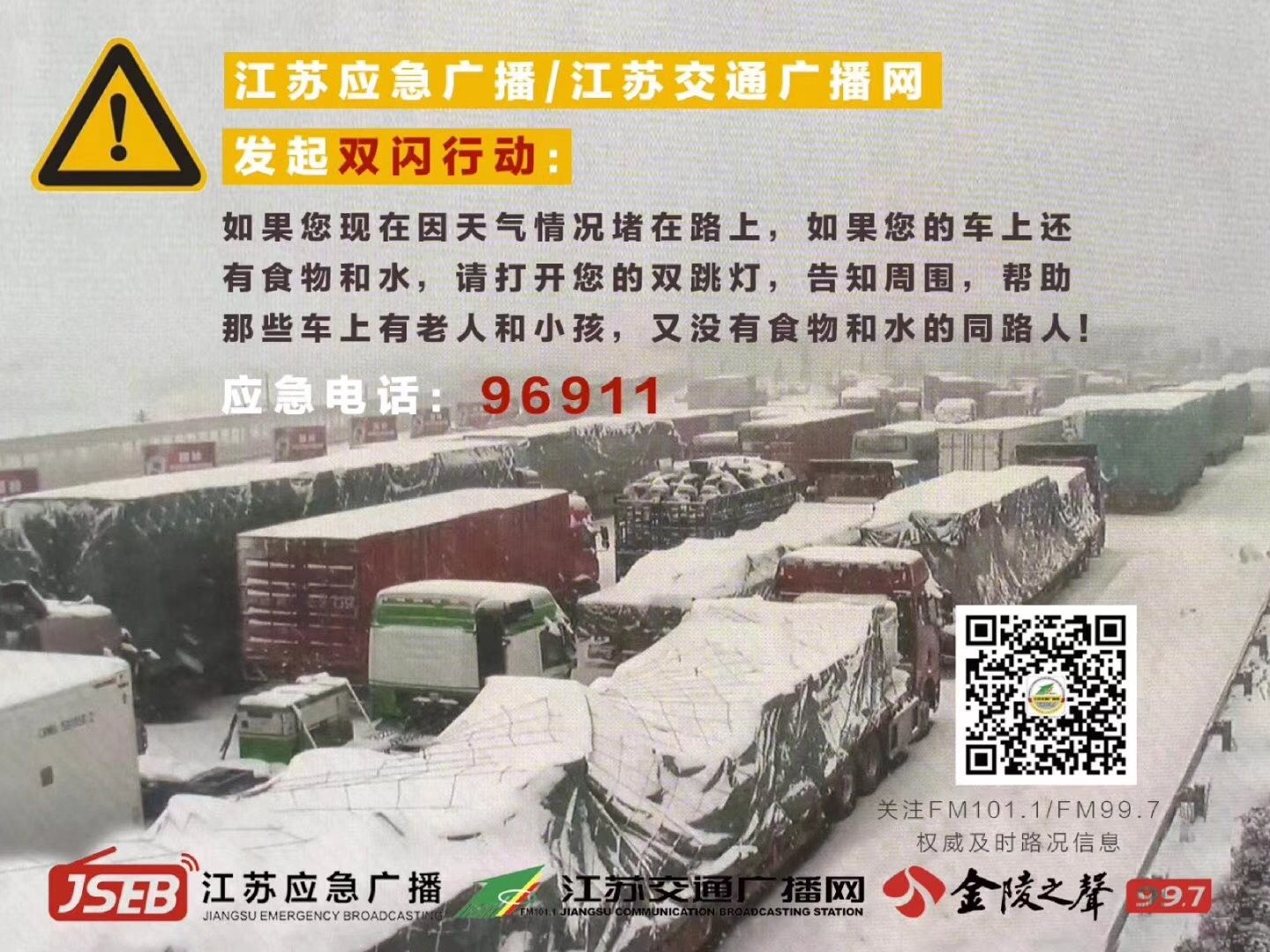 刚刚,江苏交通广播网发起“双闪行动”,如果您现在因天气情况堵在路上,如果您的车上还有食物和水,请打开您的双跳灯,告知周围,帮助那些车上有老人和小孩,又没有食物和水的同路人!