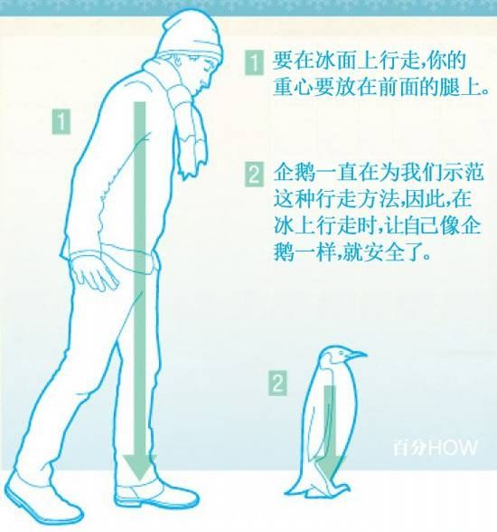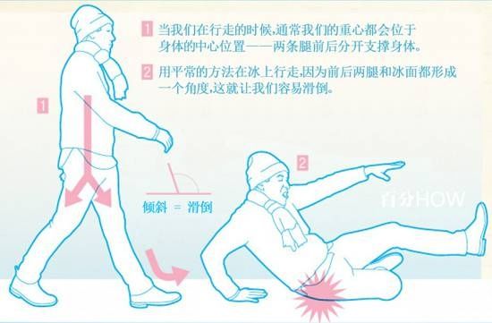 在结冰路面,如果重心不稳要摔倒,记得尽量避免用手去撑地,因为这样容易造成手臂骨折,最好有肉比较多的部分(比如臀部)着地。还有摔倒的时候,最好能护着头部,这样能避免摔倒冲击头部。