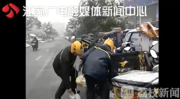 中午11点刚过,各大外卖平台的外卖小哥们已经穿梭在在常州市武进区的大街小巷里了。在一处外卖驻车点,短短十分钟内,就有近20名外卖员来回穿梭。没过一会儿,外卖车的车把、座位上都有了一层薄薄的积雪。雨雪天气,道路湿滑难行。虽然平台放宽了催送时间,但外卖需求大增,外卖员比平常更加忙碌。