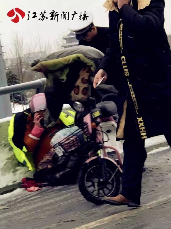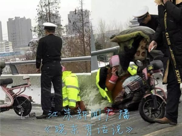 据尹先生介绍,1月25日下午4点多,他刚好开车路过宿迁市区的运河五号桥。由于雪天路滑,桥面上发生了一起多车碰擦的交通事故。事故现场,还有一名骑电动车的中年妇女,倒在地上,冻得瑟瑟发抖,表情十分痛苦。见此情景,照片上的这位执勤交警立即脱下了自己的制服,穿在了受伤的中年妇女身上。