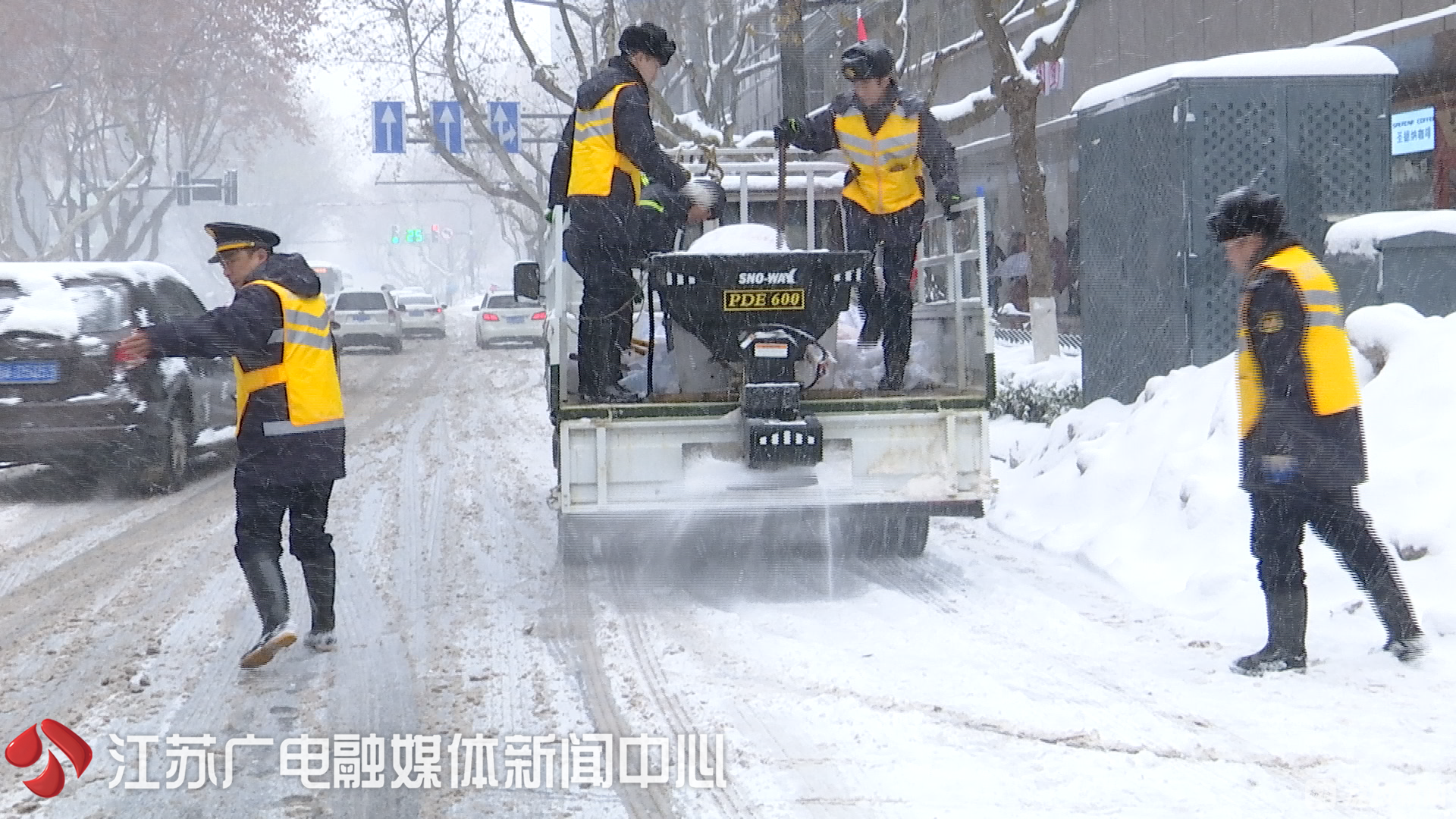 暴雪下的南京城,主次干道上,最常见到的就是这些穿着黄色安全背心的城管队员。