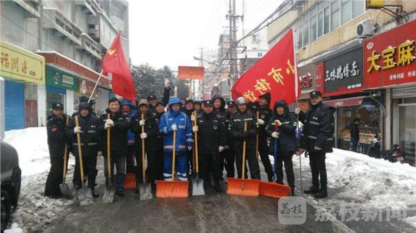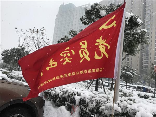 在集庆门大街地铁站附近,两面红色的旗帜迎风飘扬,上面分别写着党员突击队、青年突击队几个字。这是由中铁四局南部新城四项目部的50名青年组成的扫雪队伍。项目部经理张向奎说,这几天,他们在江东南路、梦都大街附近扫雪。只要需要,他们随时待命。