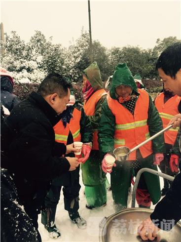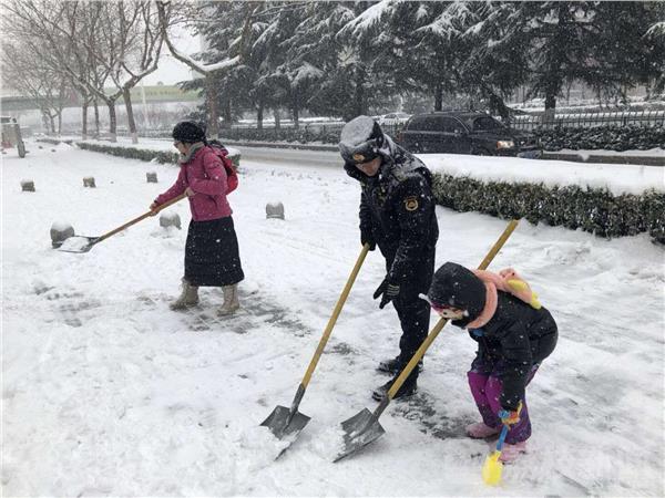 因为大雪,南京鼓楼区城管队员韩军,已经三晚睡在单位,尽管他的家距离中队只有4公里。上午十点,在银城街路口,他的妻子杨燕茹和女儿为他送来换洗衣物,也加入了扫雪队伍。杨燕茹说,非常心疼这些扫雪人员,看到大家都在扫雪,不自觉地就加入了扫雪队伍!