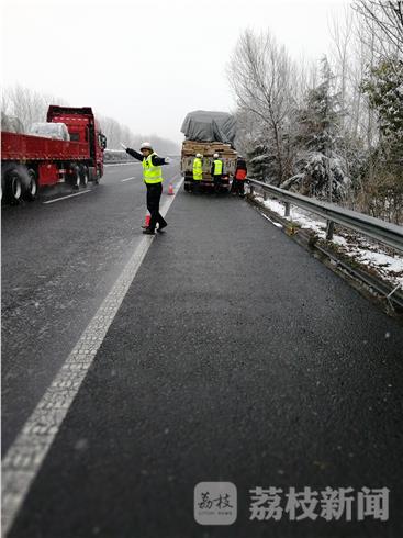 1月27日下午3时许,沿海高速南通段雪越下越大,沿海支队第四大队在G15通连方向雪岸互通附近(1114K)巡查时,发现一辆沪牌货车左后轮爆胎,车上装有板式家具。