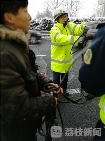 在寒冷的雪中坚持了40多分钟的执法人员,上车时,手都冻僵了,脸都冻红了,手套全湿了,车主十分感动,连说谢谢,“你们江苏高速的交通执法人员太好了!”