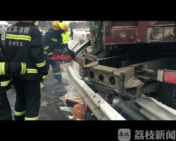 1月26日7时30分,苏州市消防支队张家港大队接到110指挥中心报警称,位于张家港市张扬公路与港华路交界处向南500米发生一起交通事故,有1人被困,情况十分紧急。接到报警后,大队迅速调派保税区特勤中队3辆消防车12 名消防官兵赶赴现场处置。