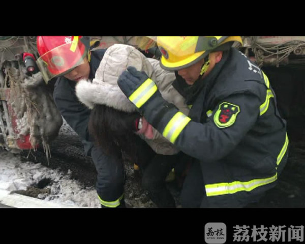 中队消防官兵到达现场后,发现一名年轻女子被卡在一辆半挂车尾部车底与马路护栏之间无法动弹,所幸受轻伤。