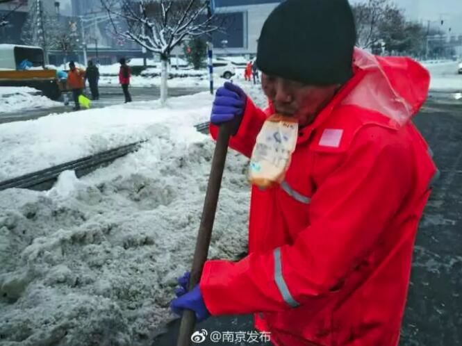 25日,南京一夜暴雪。26日早晨,多条道路的积雪已被清理干净。同时大家的微信朋友圈里,被这张照片刷屏。