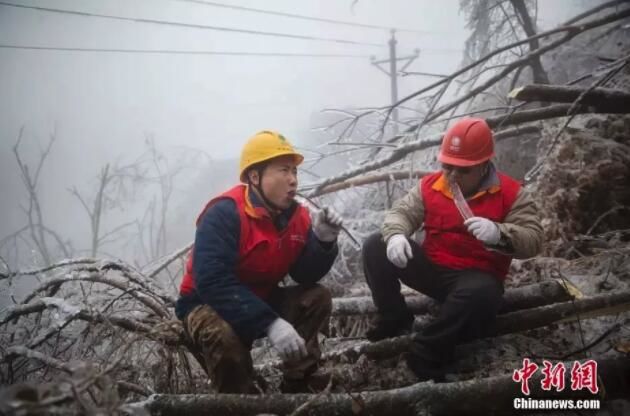 △保障输电设备安全运营,检修员冒着大雪爬上铁塔,边敲冰,边安装融冰短接线