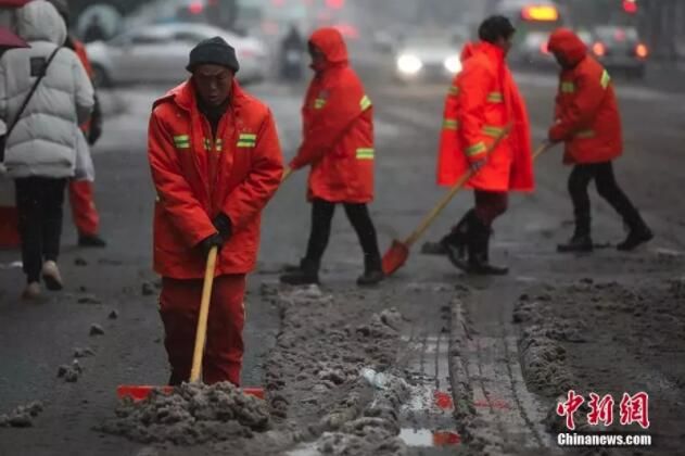 △漫天飞雪,环卫工人一大早就开始忙活