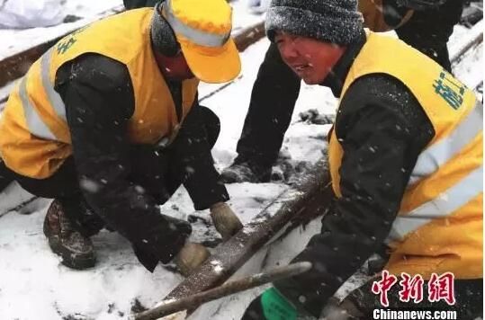△顶风冒雪,建设者进行线路铺架施工