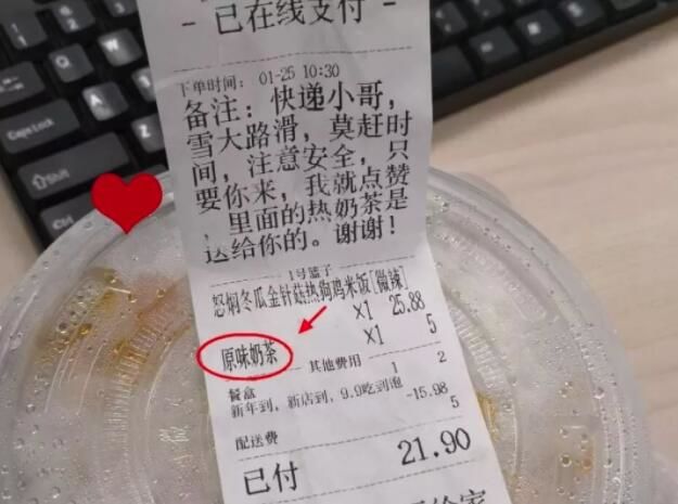 △“雪大路滑,莫赶时间,注意安全”,送给外卖小哥的这杯奶茶,温暖了寒冬。