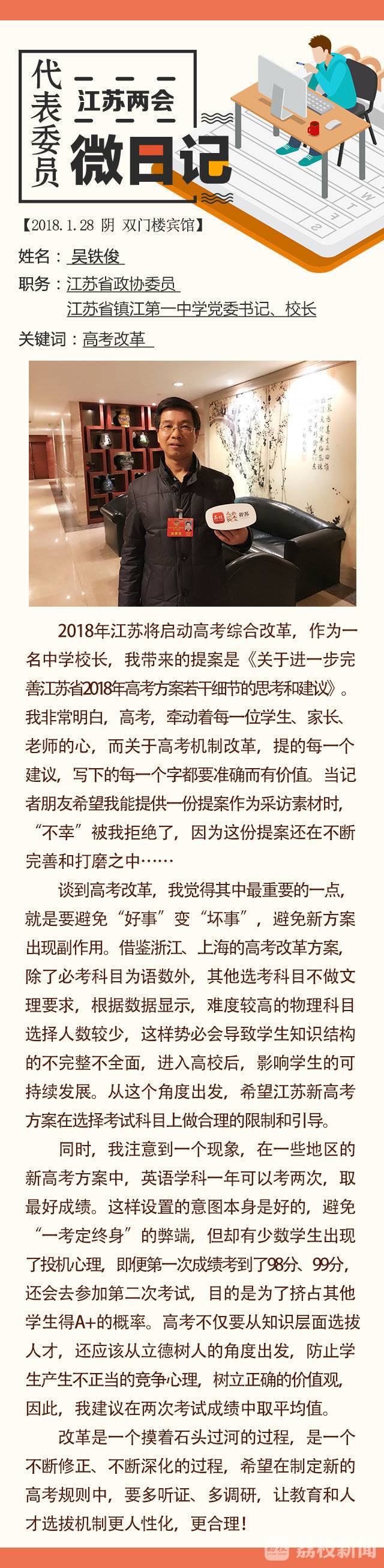 他是一位普通的中学校长,今年又多了一个重要的身份——江苏省政协委员。虽然是新委员,但是媒体对他的采访却纷至沓来,而记者对他印象最深刻的,却是一次小小的“拒绝”。这一切,还要从他的提案说起。他是吴铁俊,江苏省镇江第一中学党委书记、校长,让我们一起翻开他的“两会日记”,走进他的“两会时间”。