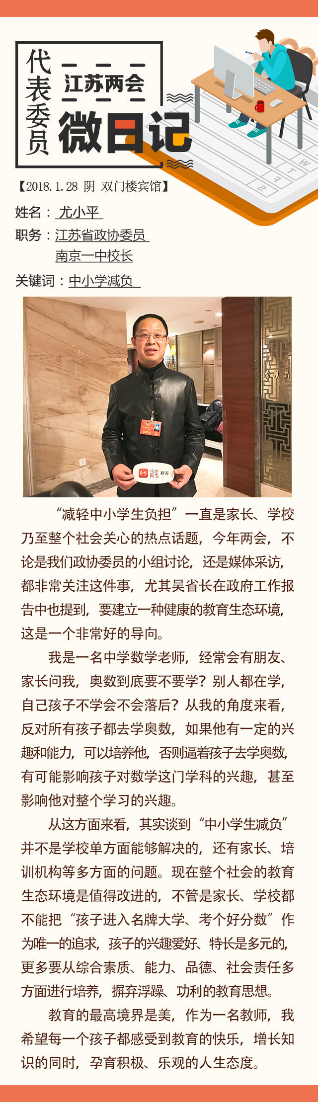 他是一位普通的中学校长,今年又多了一个重要的身份——江苏省政协委员。虽然是新委员,但是媒体对他的采访却纷至沓来,而记者对他印象最深刻的,却是一次小小的“拒绝”。这一切,还要从他的提案说起。他是吴铁俊,江苏省镇江第一中学党委书记、校长,让我们一起翻开他的“两会日记”,走进他的“两会时间”。