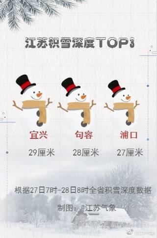 江苏省气象台首席预报员韩桂荣:“江苏的淮河以南,西部,特别是西南部这个地方,从现在监测的数据看呢,积雪深度基本上都在10公分之上,比较大的有超过20的。我们从现在看最大的是在宜兴,它的积雪深度达到了29公分,南京的最大是浦口,达到了27公分。”