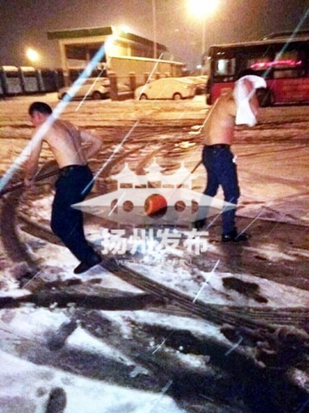 扬州公交集团二分公司经理芦杰介绍,照片上的两名光膀子的铲雪人,都是他们分公司的队长,一个叫高爱和,一个叫吴兆祥,两人都是三十多岁,吴兆祥还是公司服务明星。