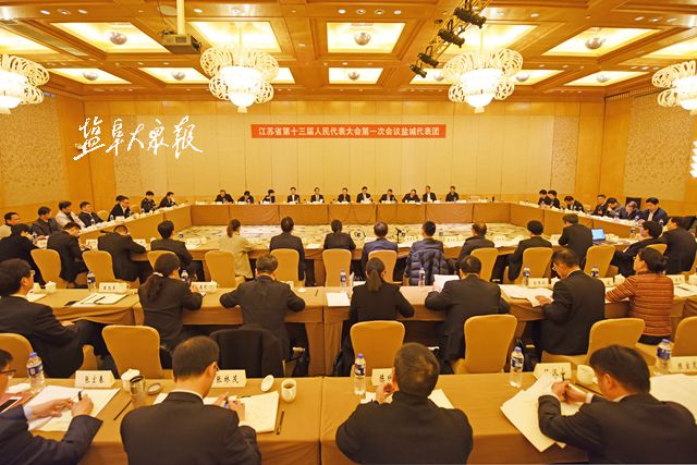 1月26日上午,江苏省第十三届人民代表大会第一次会议在江苏大剧院大会堂隆重开幕。当天下午,盐城代表团召开全体会议,认真审议政府工作报告。全国人大财政经济委员会副主任委员李学勇,省委常委、副省长杨岳参加审议。盐城代表团团长、市委书记、市人大常委会主任王荣平主持审议,代表团副团长、市委副书记、市长戴源等参加。
