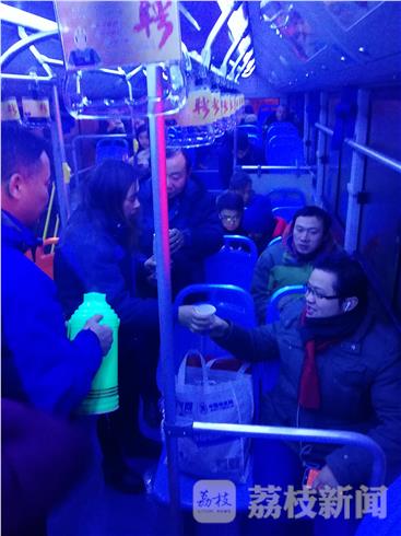 1月28日晚18:30,南京六合南站内发往东沟的624线公交车驾驶员林勇,为等候发车的乘客送上热乎乎的姜茶,为乘客驱寒,公交员工暖心之举让的乘客意外又感动。