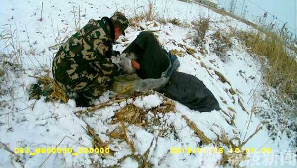 接到报警,边防民警迅速来到现场,在知情村民的指引下,在一处农田的中间位置,发现了该名流浪男子。此时他用芦苇支撑一个低矮的棚舍,身上盖了一块塑料纸,下面铺了一床已被雪水浸泡湿透的棉被,整个人蜷缩在那里,神志已经有点不清了。见此情形,边防民警迅速从附近村民家中倒来开水,并找来面包等食品,让其增加一点能量。在其神志有点恢复后,边防警官尝试着与其进行沟通,但该男子始终是一言不发,无法了解到他的相关身份信息。