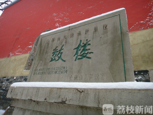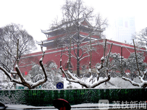 经过新年三场大雪的洗礼,已有600多年历史的南京鼓楼显得更加巍峨壮观。