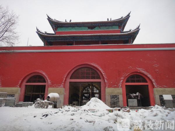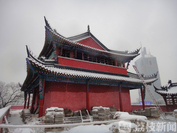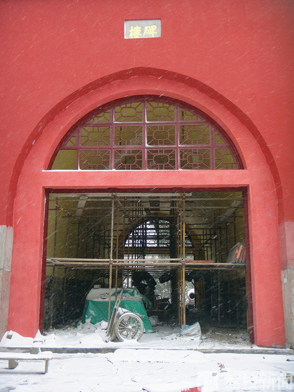 步入大门,公园内到处是银装素裹,白里透红,硃红色的鼓楼巍然屹立。由于维修工程已近尾声,主楼四周的脚手架已经拆除,彰显出的是令人耳目一新的雕梁画栋。