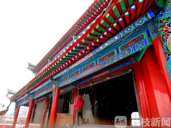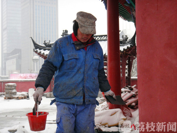 为使与南京市民阔别四年多的鼓楼公园尽快与大家见面,承担工程维修的江苏古建筑公司的工人师傅们正冒着摄氏零下8度的低温严寒,要紧张地忙碌着。