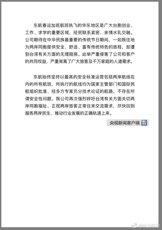 东方航空公司今晨(1月30日)8:37分在官方微博发布“关于被迫取消2018年两岸春运加班计划的声明”,106班(往返212班)春运加班航班遭到台湾民航主管机构拒绝核准,被迫取消2018年两岸春运加班计划。声明如下: