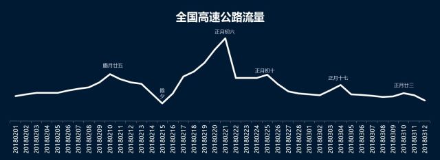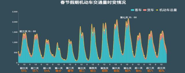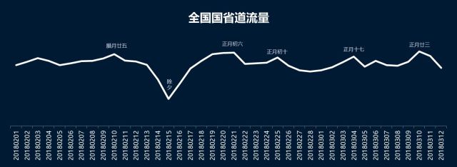 与高速公路、全路网正月初六出现明显返程高峰不同,国省干线公路在整个春运期间流量变化平稳,除了除夕前后明显减少外,其他时间出行高峰与平峰的流量差异不大。这与春运期间,公路出行以客车为主,而客车注重运行时间、一般选择高速公路出行的情况相一致。(见图3)。