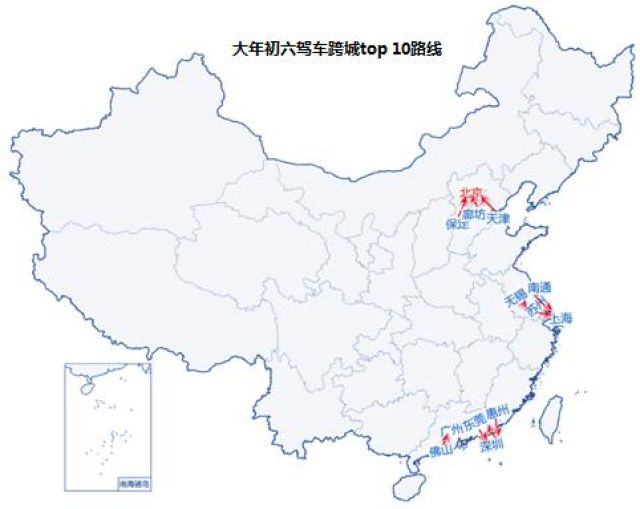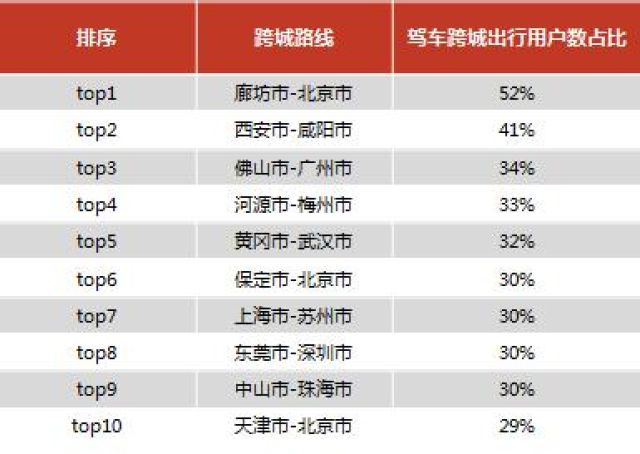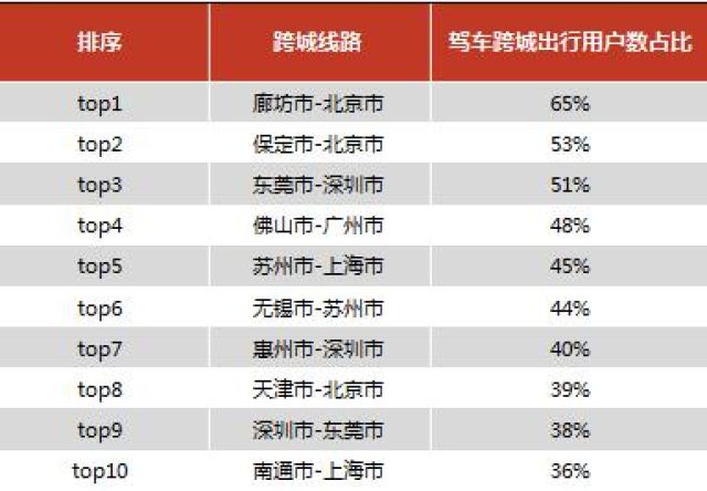 大年初二出行多是走亲访友,驾车跨城最活跃的路线主要分布在广东省,包括佛山-广州、东莞-深圳、中山-珠海等,但全国排名第一的是廊坊-北京,数据显示从廊坊驾车跨城出行的用户中有52%前往北京(见图11)。