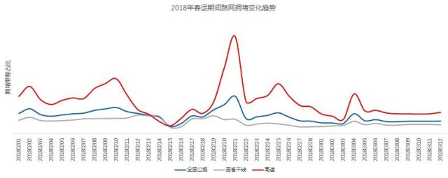 ↑图14 2018年春运期间全国公路网、国省干线交通拥堵趋势与高速公路拥堵趋势对比图